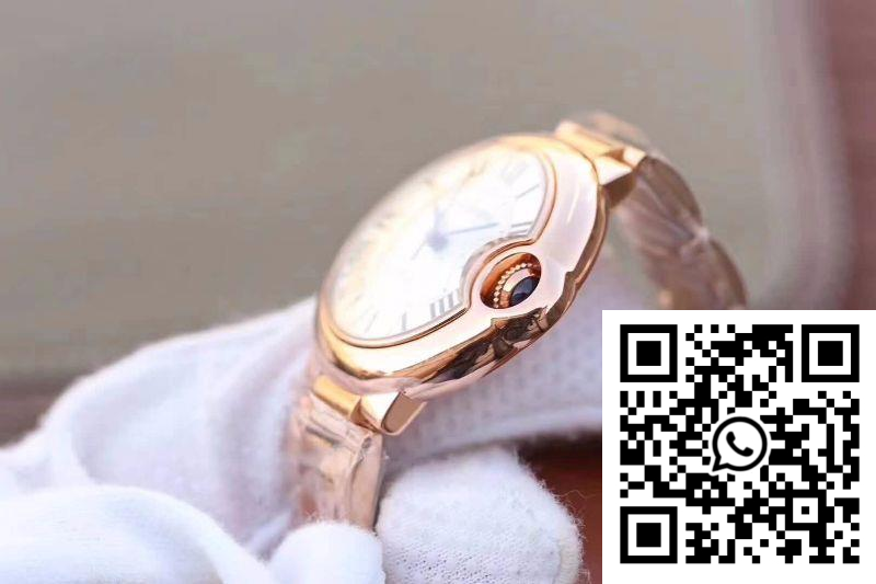 Case: The V9 Factory presents a meticulous 1:1 clone of the elegant Ballon Bleu de Cartier, featuring an exquisite 18K rose gold case. With a diameter of 33mm, this masterpiece embodies grace and timeless luxury. The case is adorned with a grooved crown set with a convex sapphire cabochon, encapsulating Cartier’s iconic design, and ensuring an unmistakable presence on the wrist.