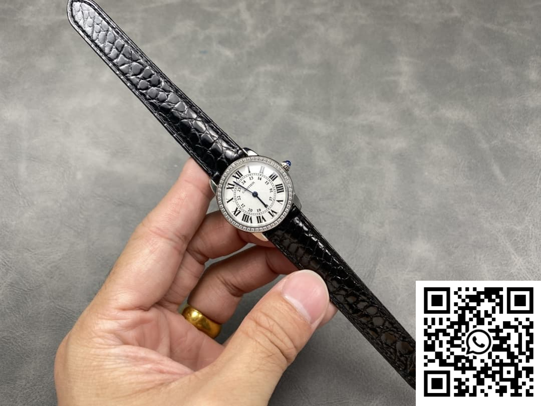 CASE: The Cartier Ronde de Cartier WR000251 replica watch boasts a precisely cloned 29mm stainless steel case, adorned with a stunning diamond-set bezel. The case is finely polished to mirror the original’s grace and detail, ensuring that the craftsmanship meets the highest standards of replica artistry. The ultra-fine finishing demonstrates a commitment to superior aesthetic quality and durability. It is perfectly sized for ladies, bringing comfort and sophistication to any wrist.
