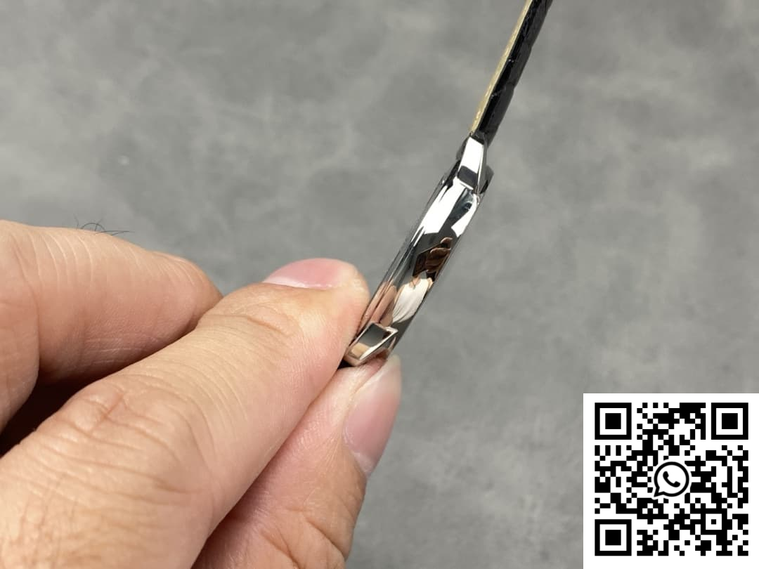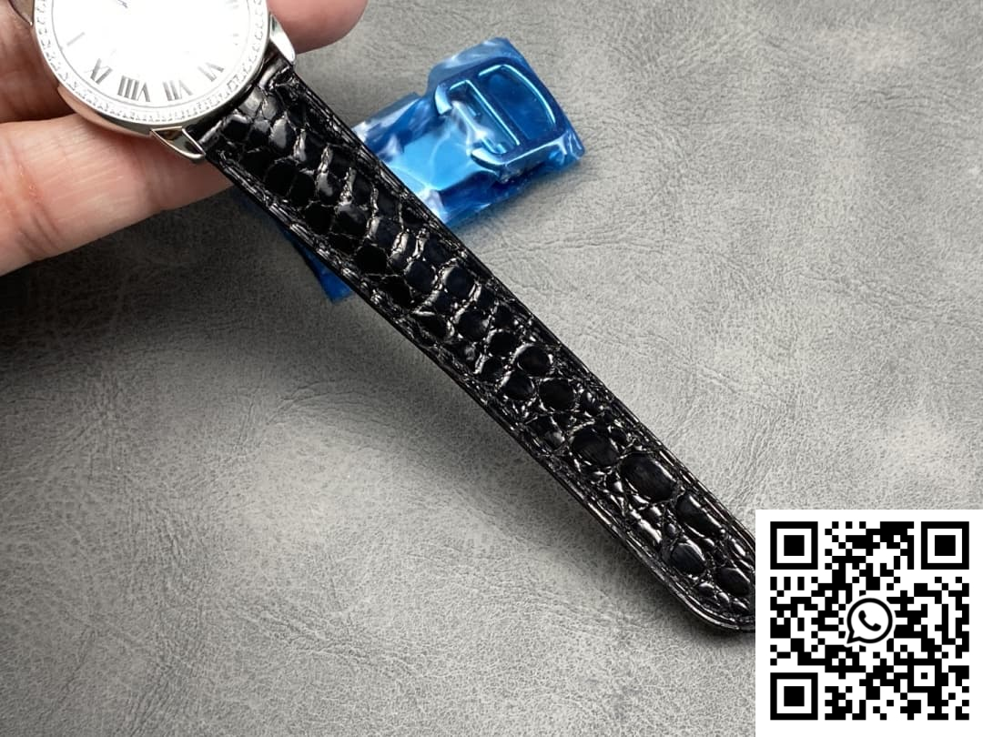 Dial: This 1:1 replica showcases a refined and minimalist silver dial that captures Cartier’s timeless design elements. The Roman numeral hour markers and sword-shaped blue steel hands are seamlessly replicated, offering identical elegance to the authentic model. The precision printing of the signatures and markings ensures that the dial’s aesthetic is indistinguishable from the genuine Cartier. The understated beauty of the dial allows it to complement both casual and formal attire effortlessly.