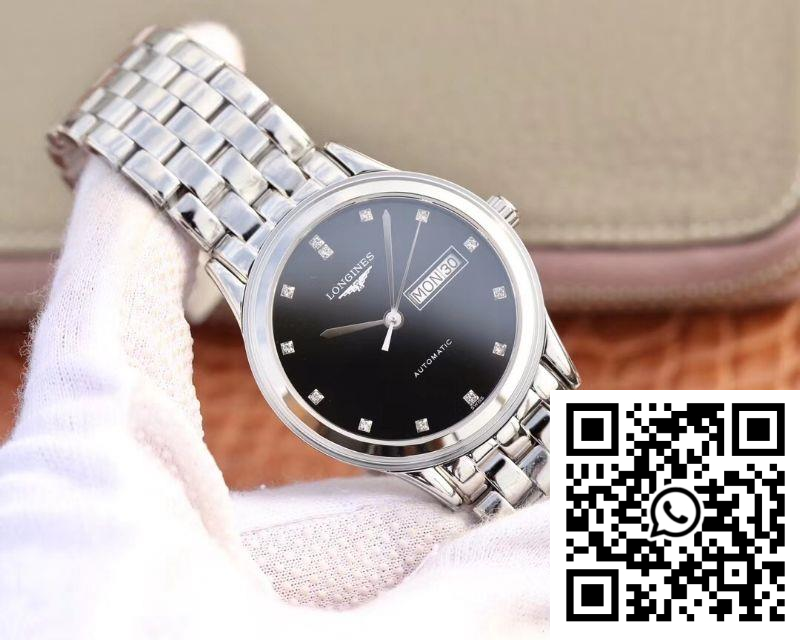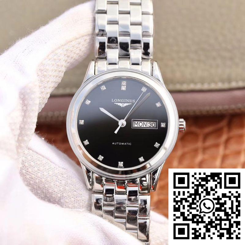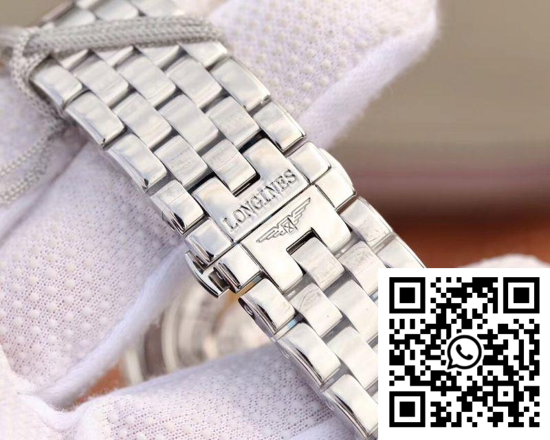 Dial: The black dial, a true highlight of this 1:1 clone, embodies elegance with its refined simplicity. It features silver-tone applied hour markers and hands, ensuring precise legibility while maintaining understated opulence. The dial layout includes a conveniently placed double calendar display, flawlessly mirroring the original watch. With this exquisite attention to detail, it’s hard to distinguish this knockoff from a genuine Longines timepiece.