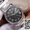 Dial: Drawing the eye into its depths, the black dial is adorned with a „wheat grain“ texture that speaks to the artistry behind this 1:1 replica. Silver-plated sand-colored hands elegantly sweep over Roman numeral hour markers, which convey classic sophistication. The dual calendar positioned at the three o’clock mark enhances functionality while maintaining aesthetic balance.