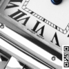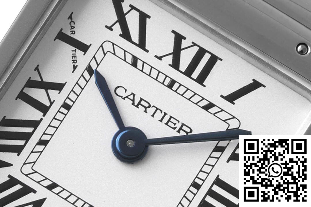 Dial: Our 1:1 clone showcases a white dial that imbibes the classic Cartier aesthetic with its time scale design. The dial’s simplicity is enhanced by the iconic blue central hour and minute hands, which dance subtly against the pristine background, capturing a tranquil elegance. This dial not only serves as an accurate replica but also exudes the brand’s signature charm, promising a timeless appeal.
