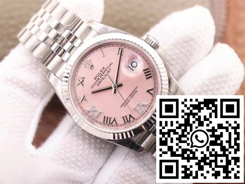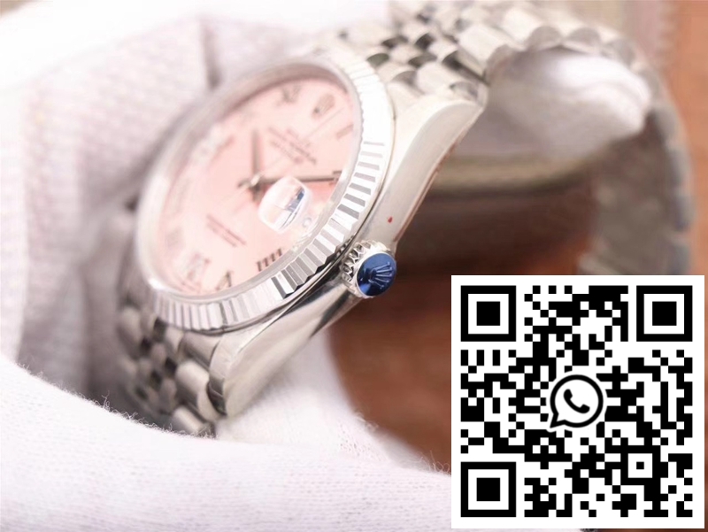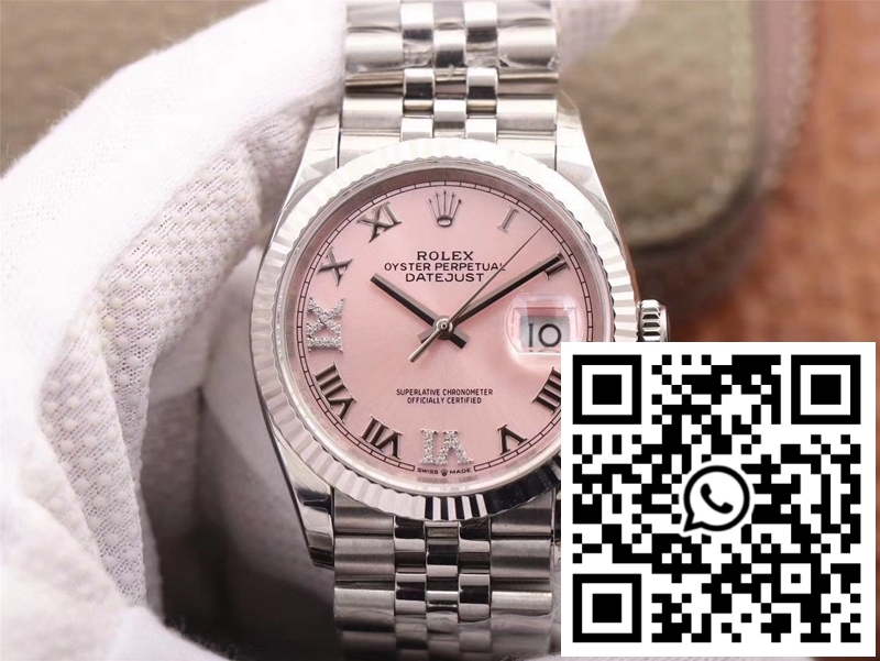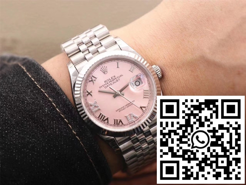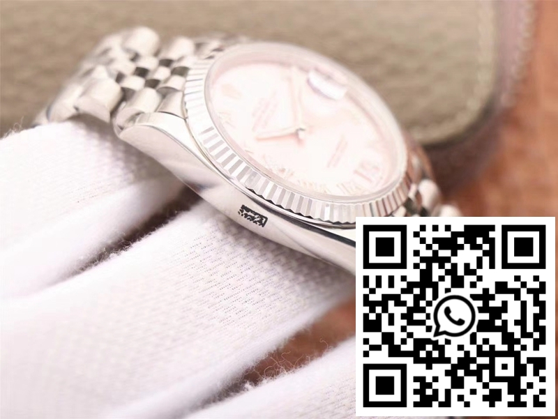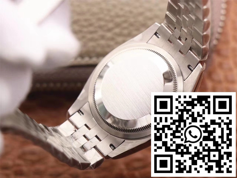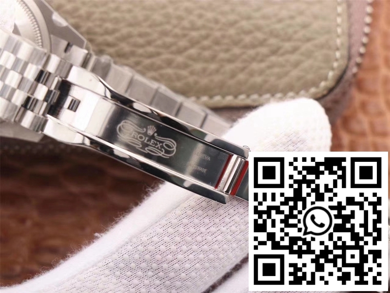 CASE: Crafted meticulously by the EW Factory, this Rolex Datejust replica showcases a solid construction with a case size of 36mm, perfectly mirroring the latest version of the genuine series. Engineered with the Swiss ETA3235 automatic movement, it ensures exceptional accuracy and reliability. The case maintains a slender profile with a thickness of only 11.7 mm, identical to the authentic model, and delivers seamless integration with the strap. The inclusion of a QR code for anti-counterfeiting purposes and an engraved model number „126233“ at the junction of the case and strap highlights intelligent design and security.