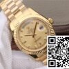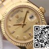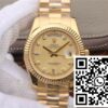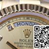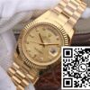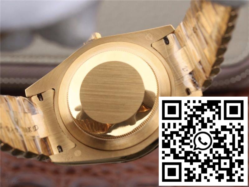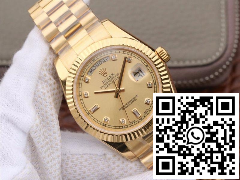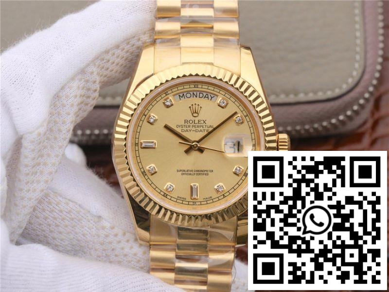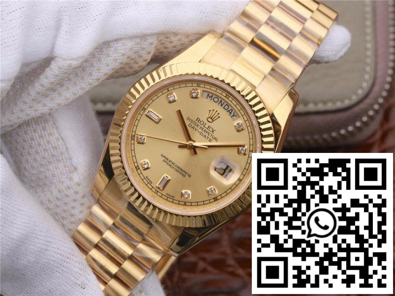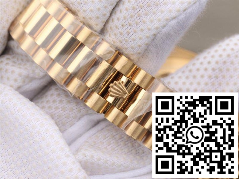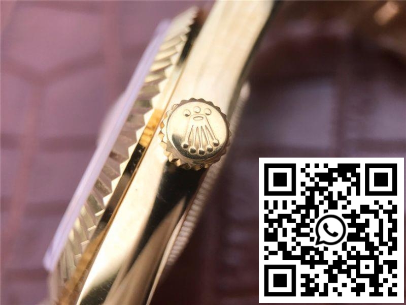 Dial: This replica masterfully captures the essence of luxury with its radiant 18K yellow gold dial, elegantly accented by gold-rimmed diamond hour markers. The gold-plated hour and minute hands contribute to a cohesive aesthetic that matches the grandeur expected from a Rolex knockoff. The precision of the calendar window located at 3 o’clock position, magnified 2.5 times, and the fan-shaped day display at 12 o’clock, reflects the same meticulous design offered by high-end copies.