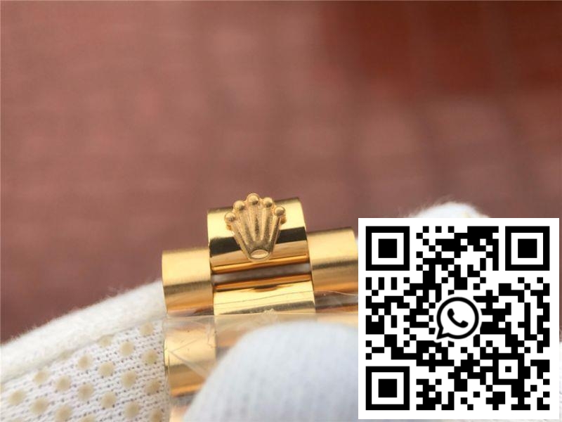 Bracelet: The gold brushed-polished strap, featuring a three-strand design, harmonizes brilliantly with the watch’s case and dial. A folding clasp adorned with the iconic Rolex crown engraving ensures security and elegance, representing a synthesis of form and function comparable to the authentic models.