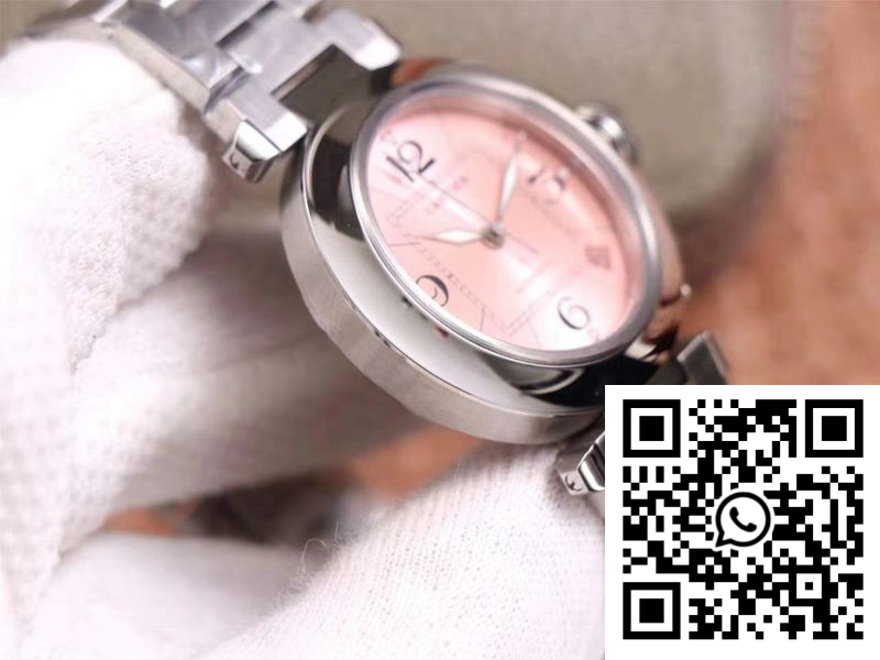 Dial: The stunning pink dial is a highlight of this clone, embodying the graceful elegance synonymous with Cartier. This unique color choice imparts a contemporary yet timeless charm which is ideal for the modern woman seeking individuality and sophistication. The textured surface captures the light beautifully, echoing the meticulously replicated details from the genuine version.