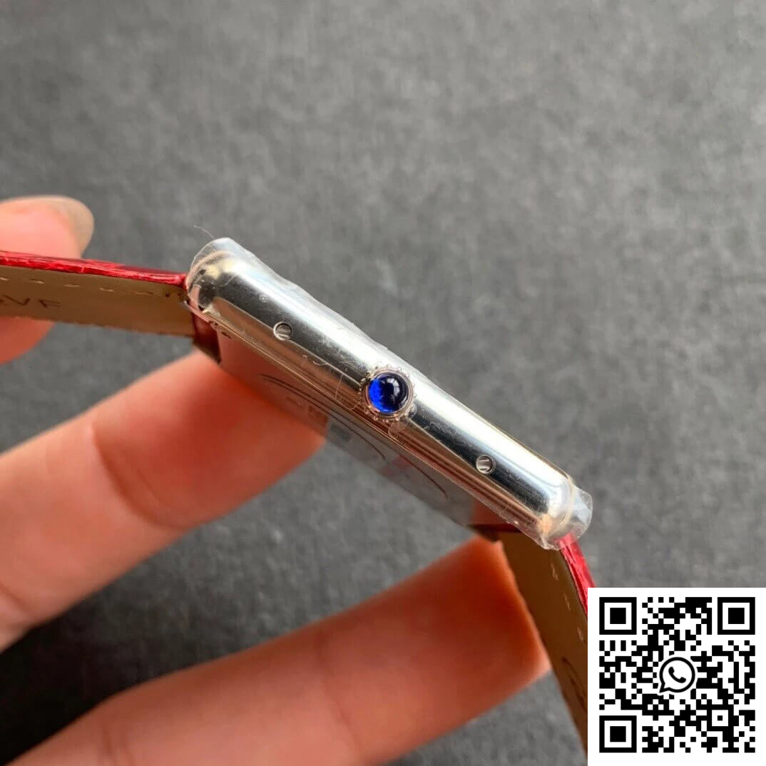 CASE: The Cartier Tank W5200005 K11 Factory White Dial replica watch features a beautifully crafted stainless steel case measuring 31mm x 24mm, offering both sophistication and a comfortable fit ideal for ladies. The case is adorned with a cabochon-shaped synthetic spinel, adding a touch of luxury and refinement to its design. Meticulously manufactured as a 1:1 clone, the case replicates Cartier’s iconic craftsmanship with flawless attention to detail.