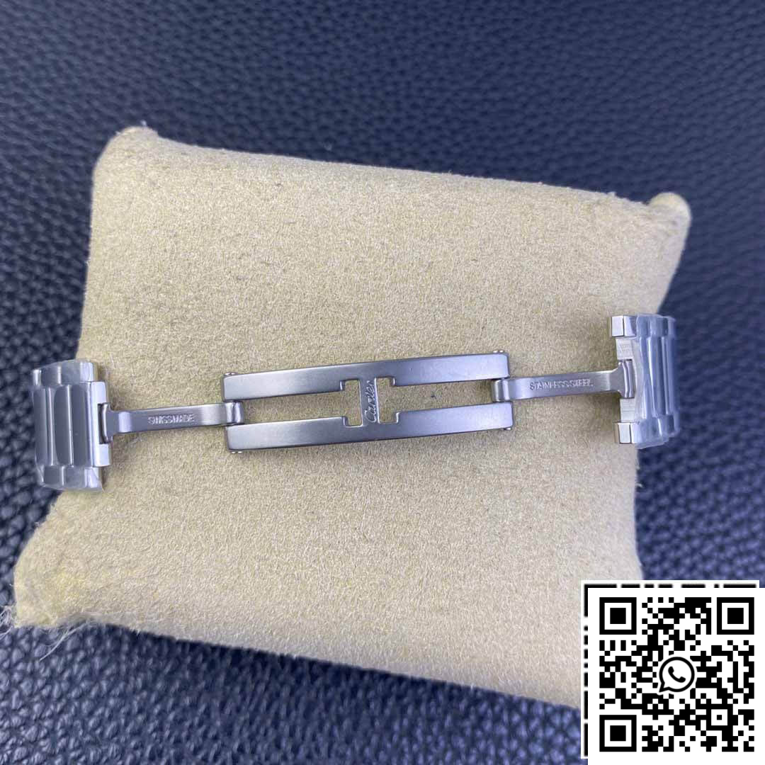 Dial: The watch features a beautifully crafted silver white dial that captures the essence of Cartier’s timeless design. Distinctive sword-shaped blue tempered steel hands glide smoothly across the dial, adding a pop of color and vibrancy. The classy design is further complemented by a blue spinel cabochon set into the crown, mirroring Cartier’s classic aesthetic details. The attention to detail ensures this replica is a 1:1 copy of the genuine model.