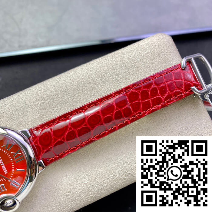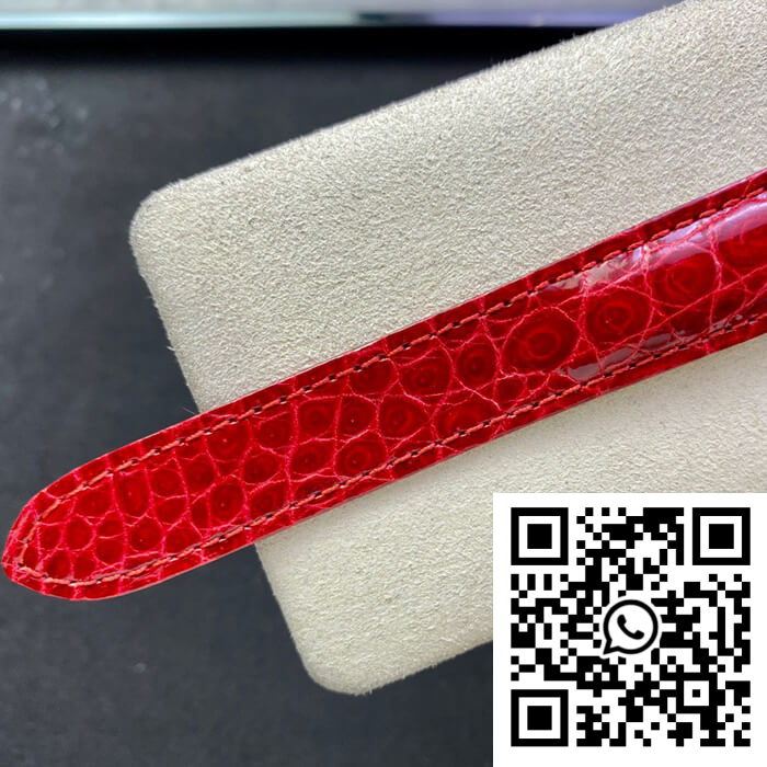 Bracelet: A luxurious red leather strap adds a splash of color and comfort to this Cartier replica. The strap is meticulously crafted to provide both durability and style, making it a chic companion for any occasion. This rich, plush leather accentuates the watch’s sophisticated persona, perfectly complementing its stainless steel case.