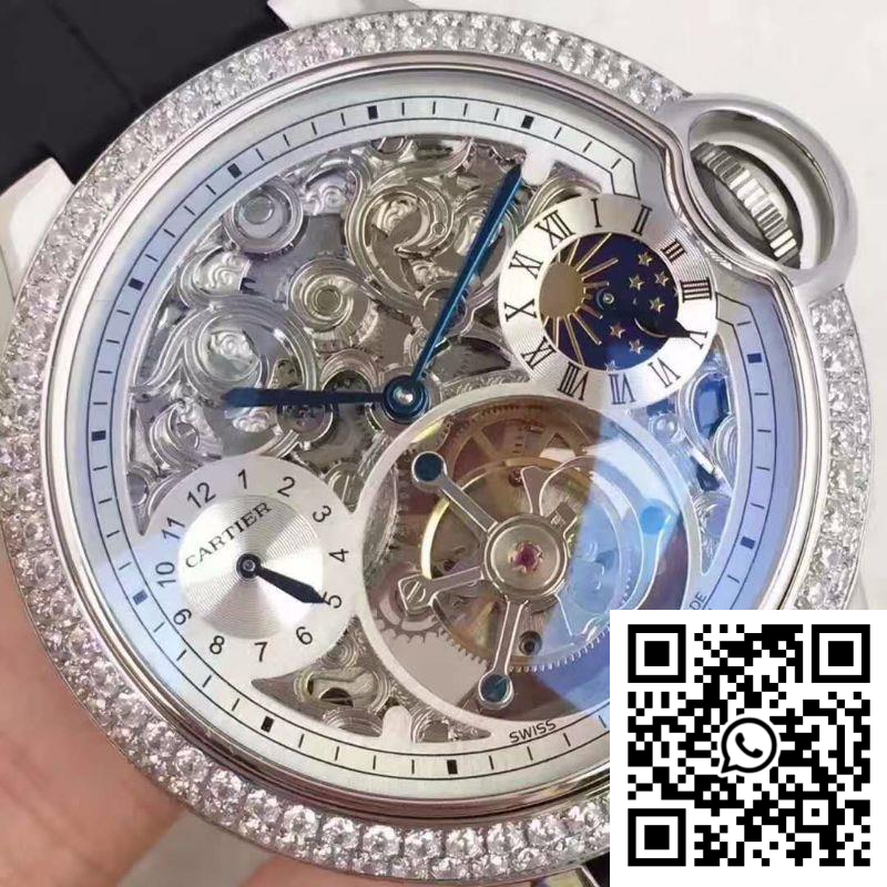 CASE: Embrace the elegance of Cartier with our meticulously crafted replica masterpiece. The Ballon Bleu De Cartier Tourbillon Silver Dial knockoff watch features a 46mm brushed fine steel case that captures the sophistication synonymous with Swiss timepieces. Its construction remains faithful to the original, offering the same opulent feel and striking aesthetics that make it a classic.