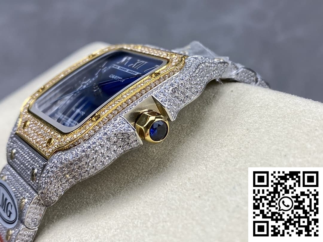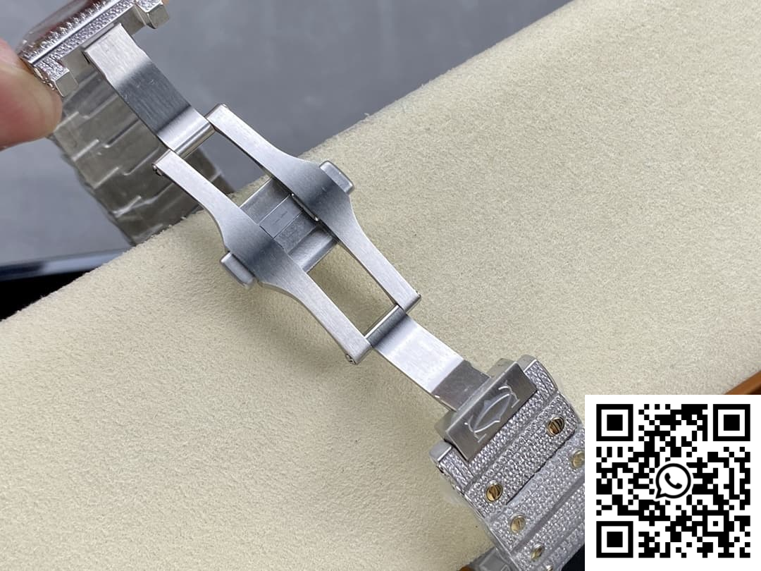 CASE: The Cartier Santos W2SA0022 replica watch emerges triumphantly from the prestigious AMG Factory, showcasing a 40mm case adorned with exquisite diamonds. Each jewel is meticulously set to accentuate the watch’s luxurious appeal, while the stainless steel construction provides a reliable and robust frame. An interplay of polished and brushed finishes ensures that this 1:1 knockoff captures the essence and grandeur of the original Santos series, delivering a touch of sophistication to every wrist.