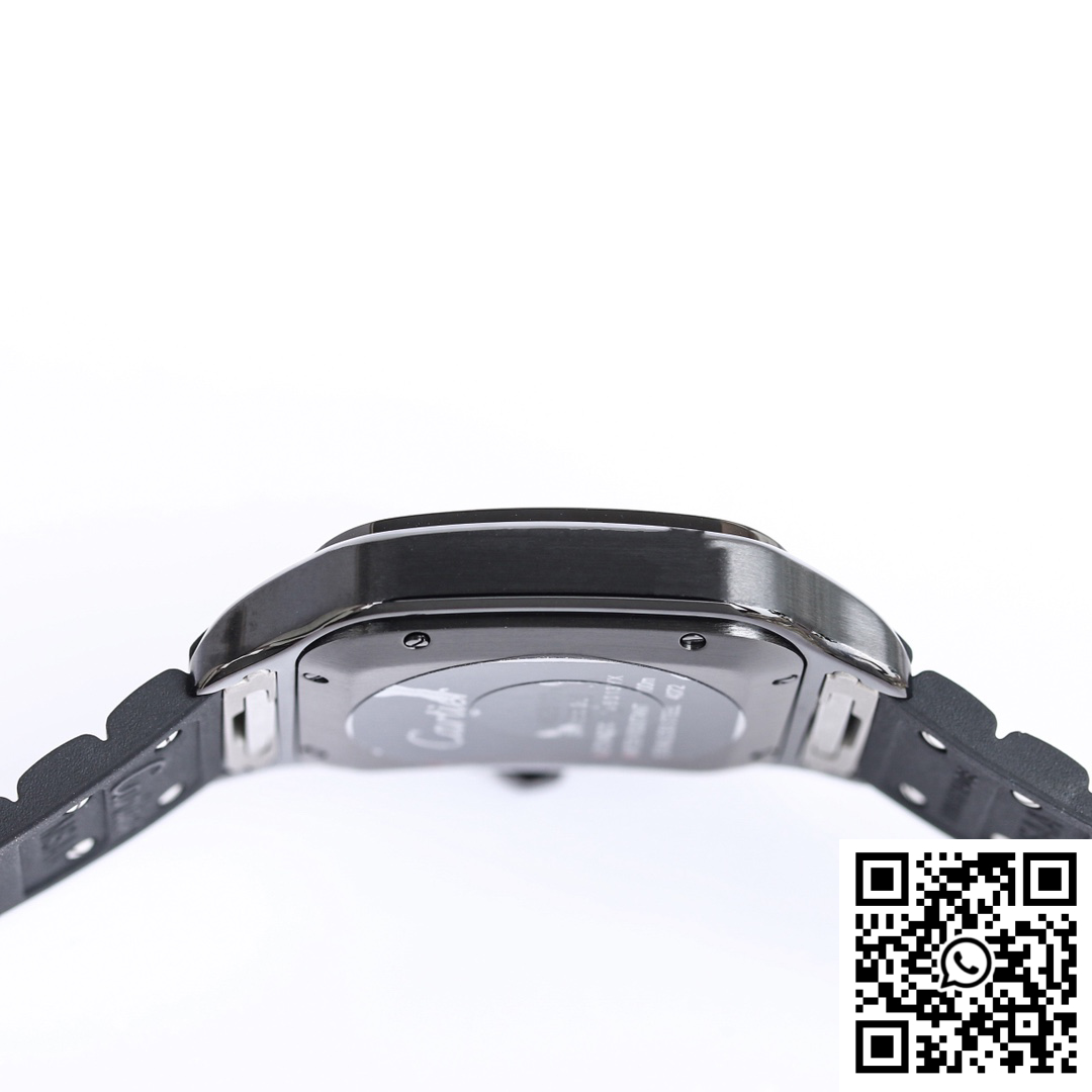 CASE: The Fake Cartier Santos WSSA0039 GF Factory V2 Black Case replica watch boasts an expertly crafted solid stainless steel case size of 39.8mm. The cutting-edge black plating design mirrors the original official Cartier model, ensuring durability and color retention. The brushed texture and polished rounded edges are meticulously replicated, creating a seamless blend of matte and gloss finishes. Fixed with eight robust screws, the case construction guarantees long-lasting sturdiness while maintaining the refined elegance of the original model.