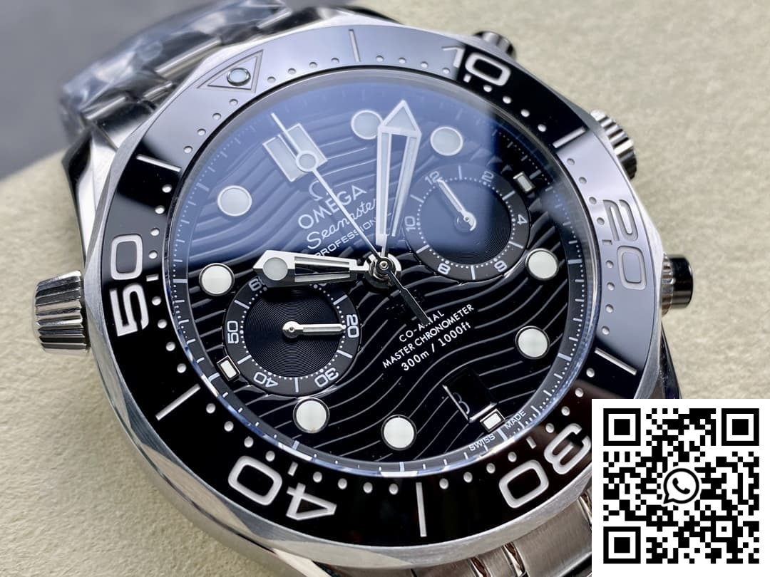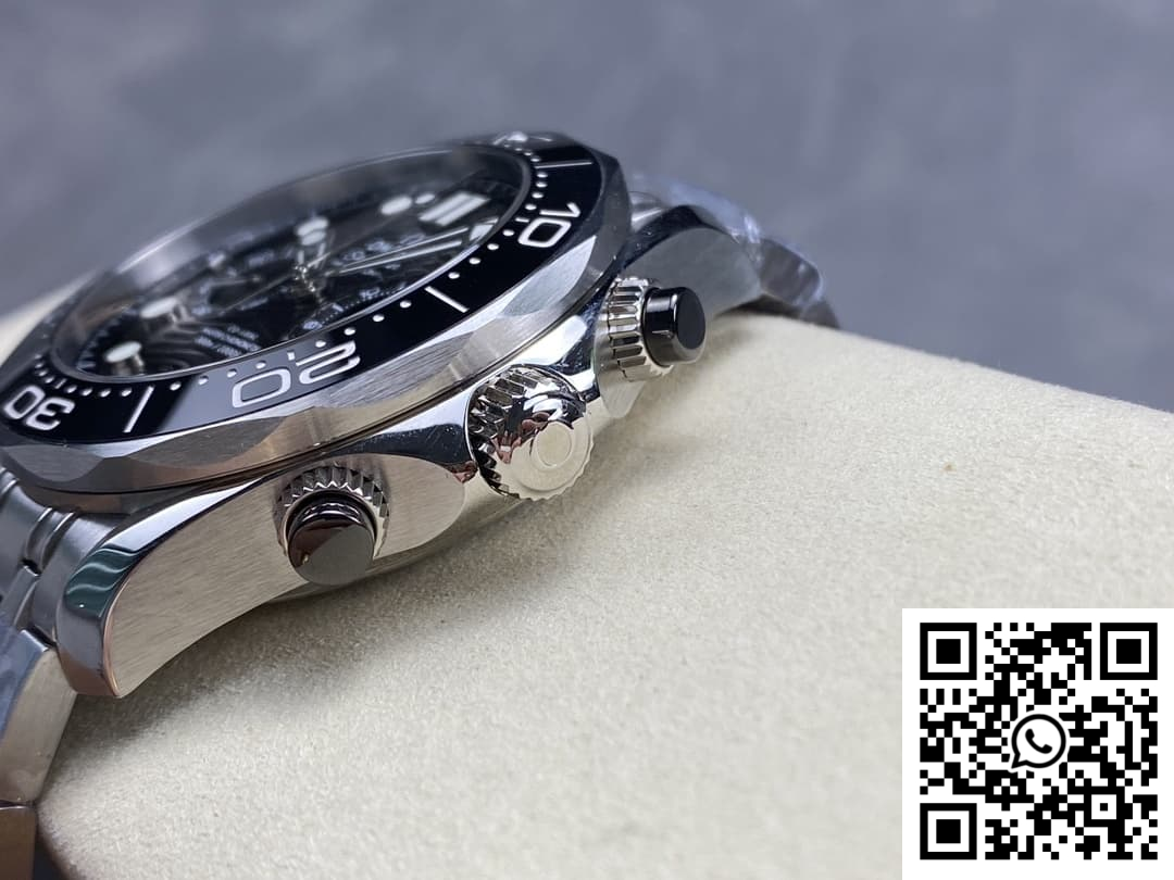 Bezel: The unidirectional ceramic bezel, renowned for its durability and striking appearance, is expertly replicated to capture the genuine Omega Seamaster’s design. This knockoff’s attention to detail, from the numerals to the scalloped edges, ensures a perfect imitation that is both stylish and functional.