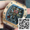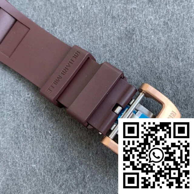 Bracelet: The watch comes with a comfortable and durable brown rubber strap, which complements the rose gold case spectacularly. Designed for optimal wearability, the bracelet is not only style-conscious but also practical, embodying Richard Mille’s ethos of sporty elegance.