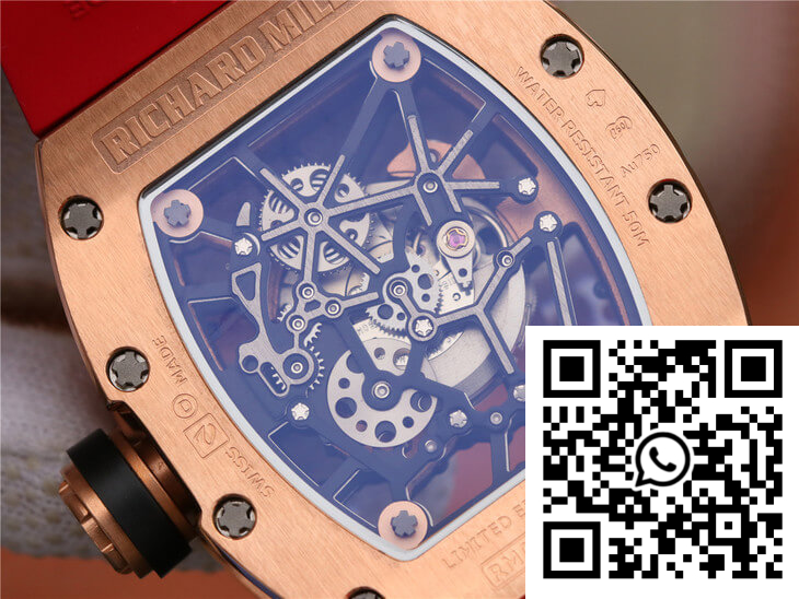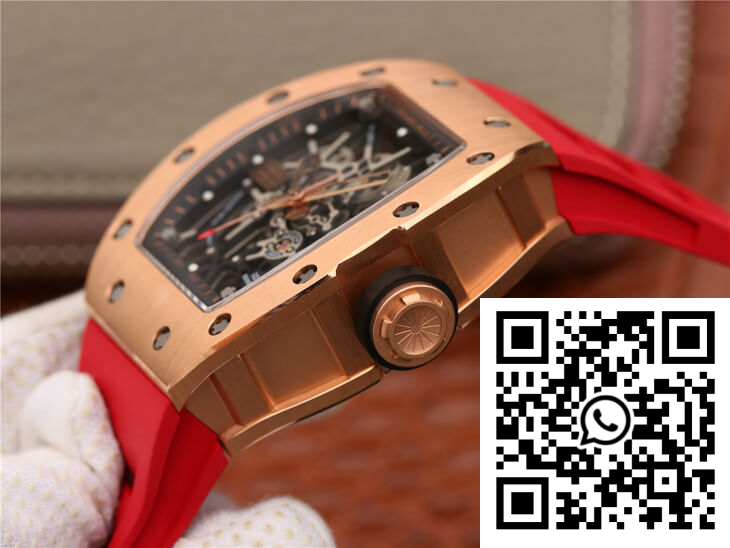 Bezel: The watch features a bezel that continues the rose gold luxury theme, encapsulating the essence of Richard Mille’s avant-garde aesthetic. Its design, like a precious frame, embraces the central dial and contributes to the knockoff’s captivating appeal, enhancing both visual intrigue and structural integrity.