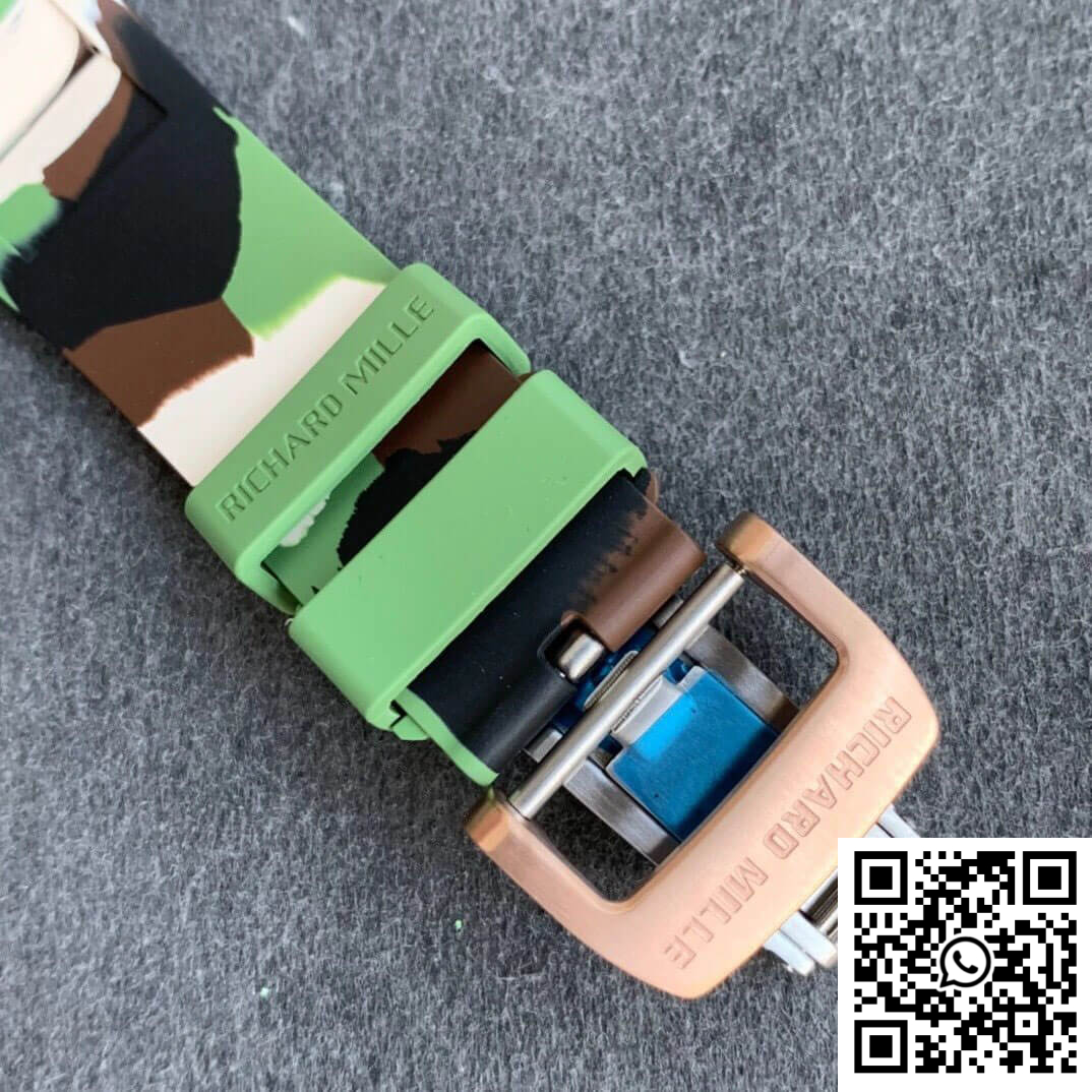 Dial: The dial of this replica watch enhances its aesthetic with a unique camouflage design that is both modern and timeless. The markers and hands are a testament to the attention to detail that KV Factory has become synonymous with. Each element has been carefully cloned to preserve the authenticity of the Richard Mille’s spirit.