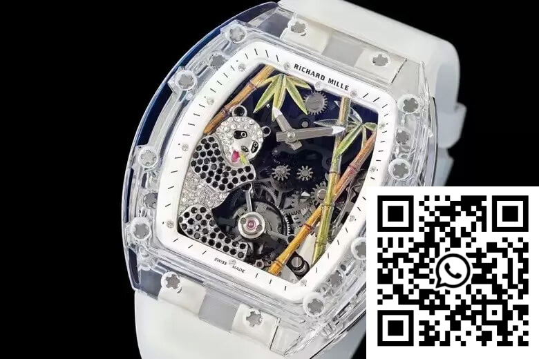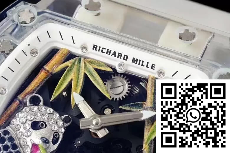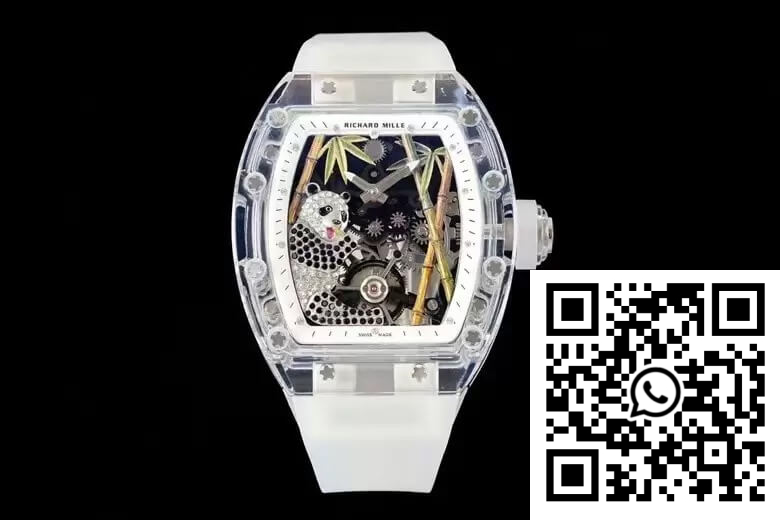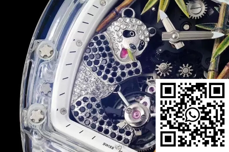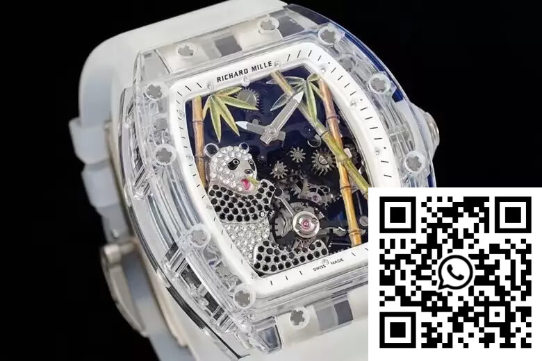 Dial: Inside the vibrant dial, a charming depiction of a panda leisurely enjoying bamboo adds a whimsical touch, echoing Richard Mille’s artistry. The dial’s transparency, achieved through a double hollow base plate, allows enthusiasts to fully appreciate the intricate SWISS Tourbillon Movement—a hallmark of sophistication in watch authentication and replication.