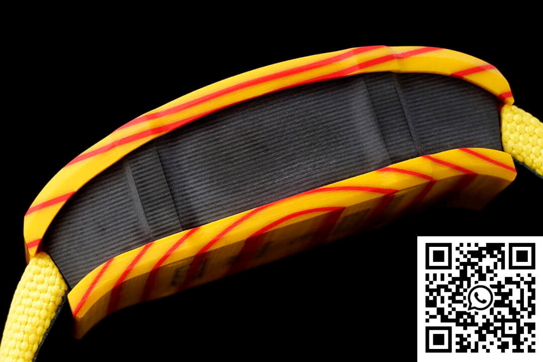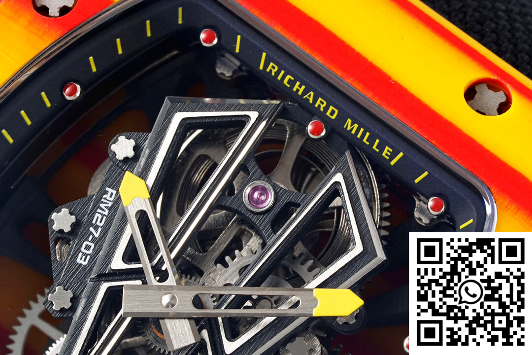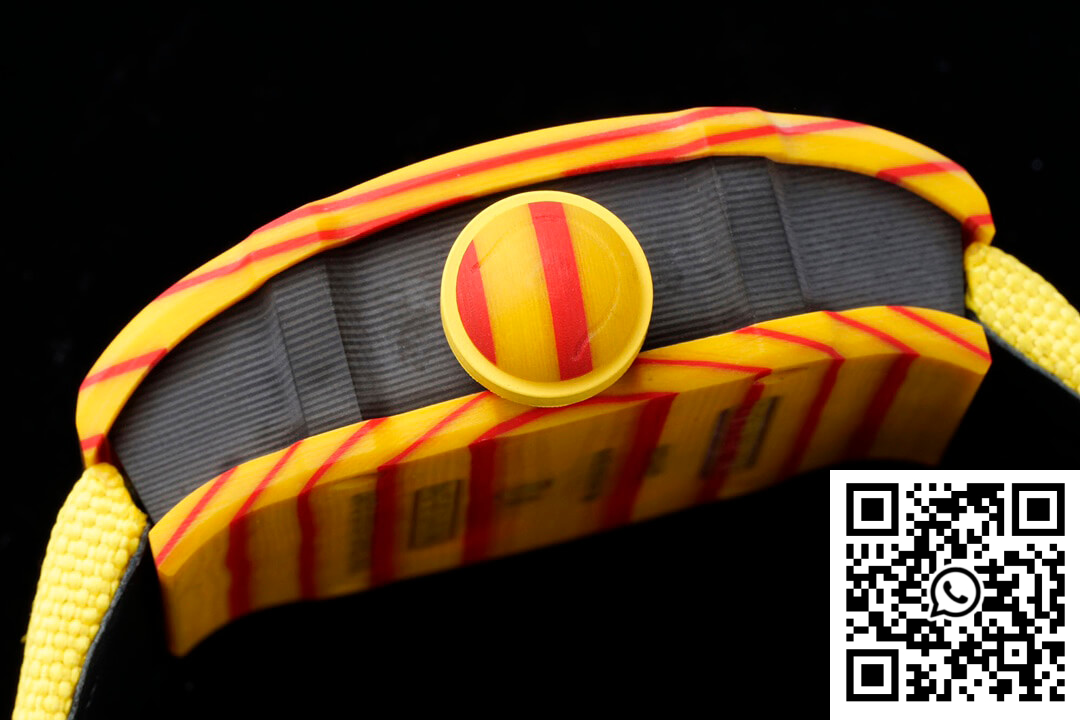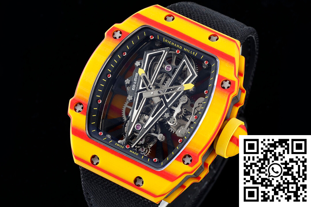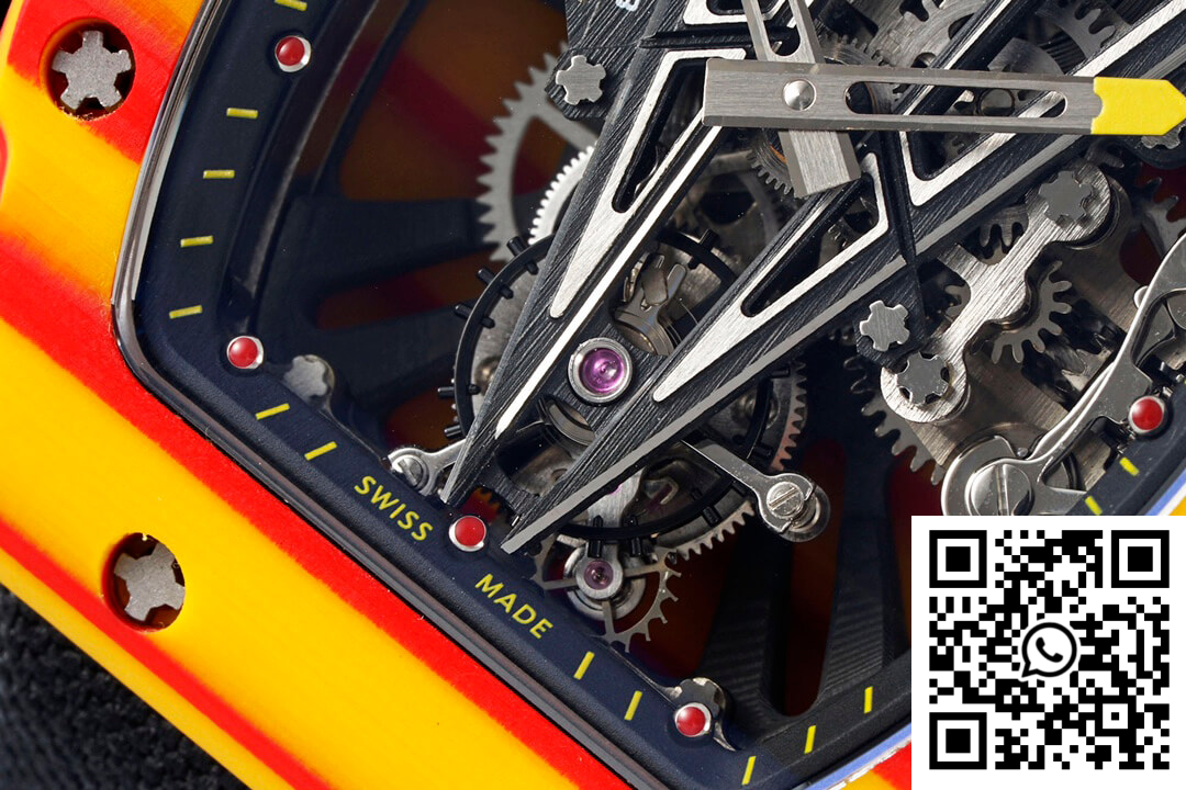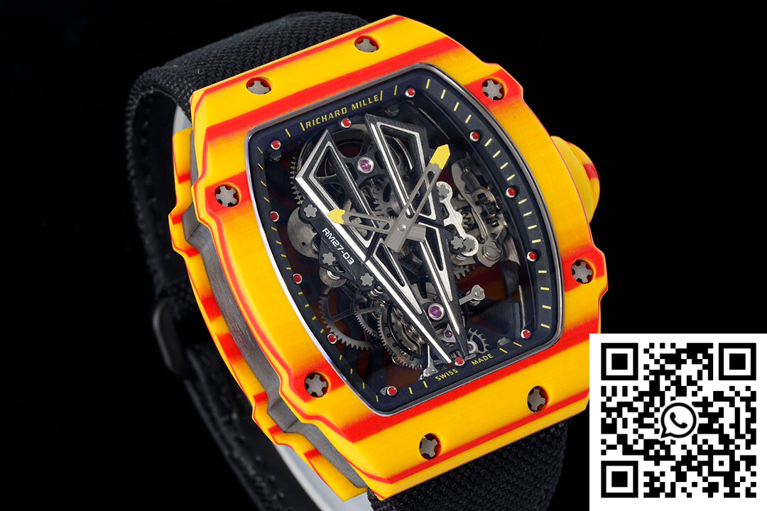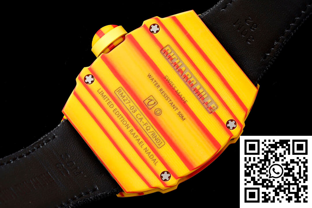 CASE: The Richard Mille RM27-03 Rafael Nadal replica watch stands as a testament to innovative engineering and artistry with its robust, one-piece 47.77mm x 40.30mm case crafted from TPT Quartz material. Known for its extraordinary durability and resistance to impact, this case ensures the ultimate protection for the intricate mechanics within. The bold orange body draws inspiration from the Spanish flag, complemented by its textured finish and intricate detailing to deliver a statement of style and substance.