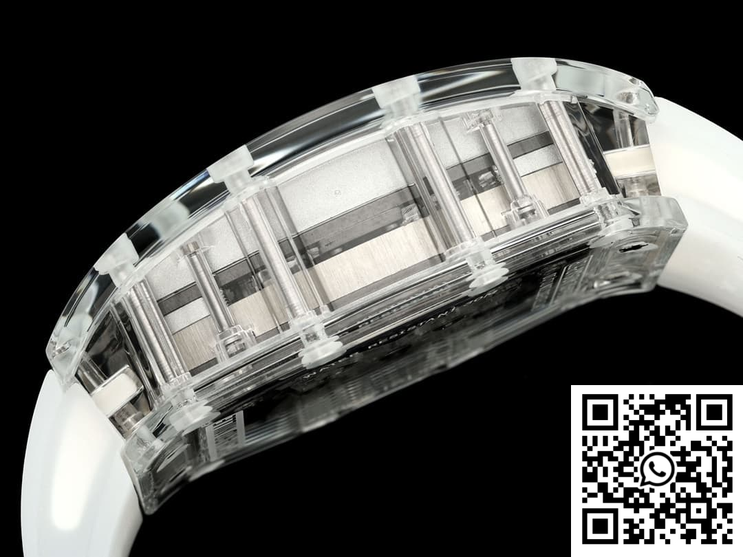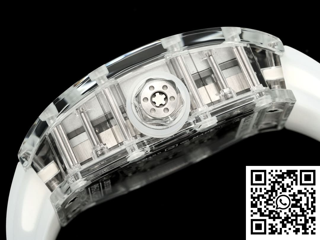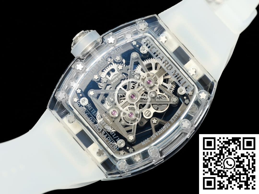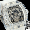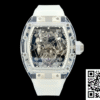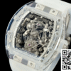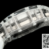 CASE: The meticulously crafted transparent case of the Richard Miller RM 56-02 replica is a brilliant showcase of modern watchmaking. Sized at 50.50mm by 42.70mm, the case is designed using advanced materials to emulate the original’s luxurious crystal-clear aesthetic. The polished ultra-fine case surface guarantees durability while maintaining an elegant, minimalist look. Its transparency beautifully reveals the intricate craftsmanship inside, delivering an unforgettable visual experience.