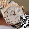 Dial: The white dial of this replica embodies timeless elegance, accentuated by diamond hour markers set in rose gold plating. Each of the hour markers is distinctly replicated for brilliance, complemented by the gold-plated hour, minute, and second hands. At the 3 o’clock position, you’ll find a 2.5-fold convex date display window, ensuring the replica maintains the functional charm of its genuine counterpart.