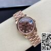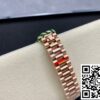 Dial: The intricate detailing of the dial reflects a passion for precise craftsmanship. The golden hour markers are polished to a luster that complements the rose gold case, undoubtedly adding to the watch’s allure. Every element on the dial, from the Rolex logo to the perfectly placed date index, is hand-finished to ensure that each watch maintains the brand’s tradition of excellence.