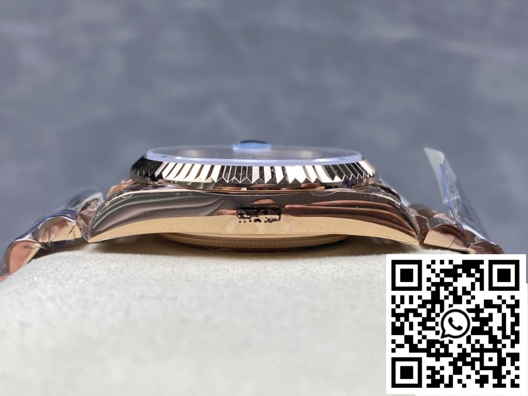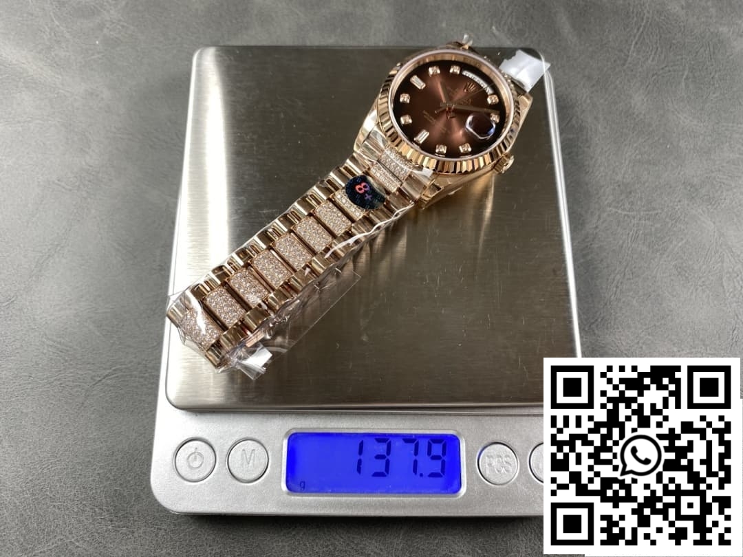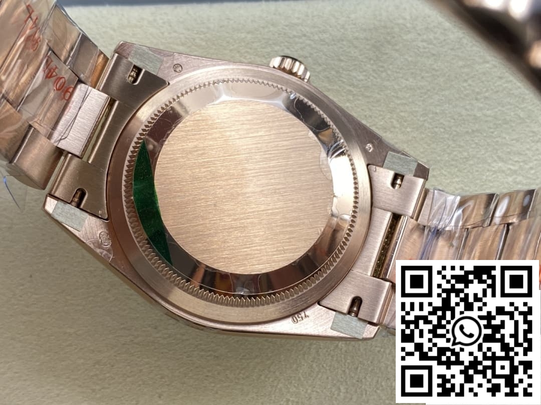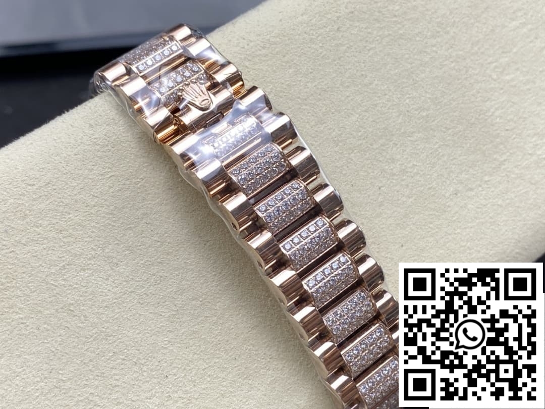 – **CASE**: The robust 36mm case of this replica watch is crafted with precision, reflecting the exact dimensions and proportions of the original Rolex Day-Date. Each piece is meticulously polished to achieve an ultra-fine finish, enhancing its durability and aesthetic appeal. A fixed, diamond-set bezel encircles the dial, exuding an aura of luxury and sophistication synonymous with Rolex design.