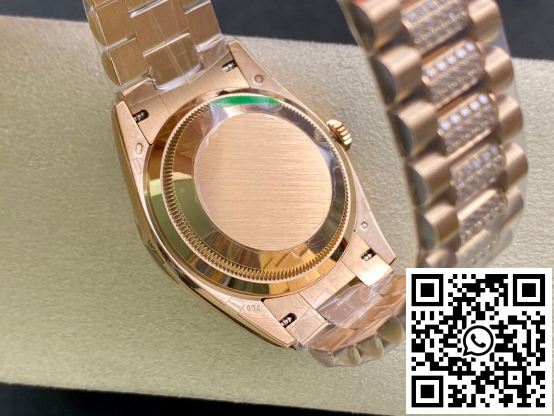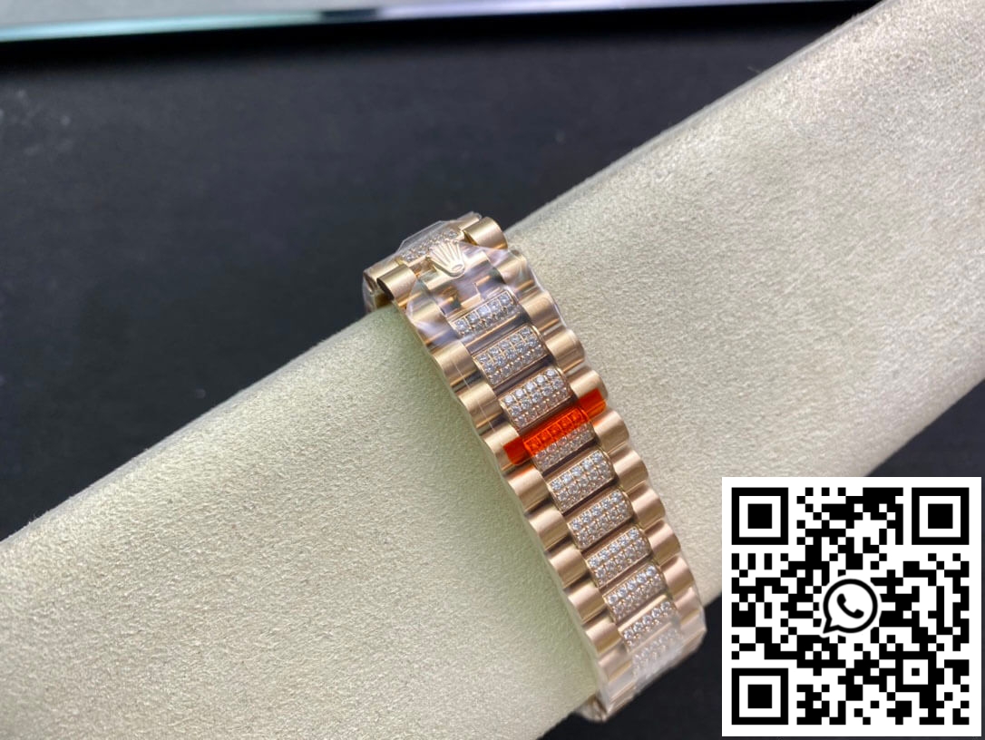CASE: Step into sophistication with the EW Factory replica of the Rolex Day Date M128345RBR-0020. The case, meticulously crafted to replicate the original, is composed of rare and exquisite 18K rose gold, expertly polished to shine with timeless allure. At a precise 36 mm diameter, this watch finds a perfect balance between boldness and grace, offering an ideal watch fit that complements various wrist sizes.
