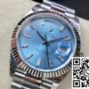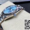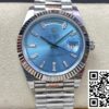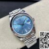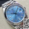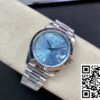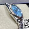 Dial: The dial stands out with its ice blue color, a striking choice faithfully replicated by EW Factory. The diamond-set hour markers add undeniable luxury and sophistication, while the day of the week is displayed prominently at 12 o’clock, and the date at 3 o’clock. Each marker and hand exudes the high craftsmanship synonymous with Rolex, matched accurately in this 1:1 knockoff.