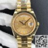 CASE: The Rolex Day-Date M228238-0005 replica watch by EW Factory features a meticulously crafted 40mm case made from high-quality yellow gold-plated stainless steel to mimic the luxurious allure of genuine Rolex timepieces. The case incorporates a screw-down back, ensuring optimal water resistance and durability. Its triangular pit pattern—an iconic feature evolved from practicality to aesthetic distinction—is faithfully replicated, ensuring consistency with genuine Rolex designs.