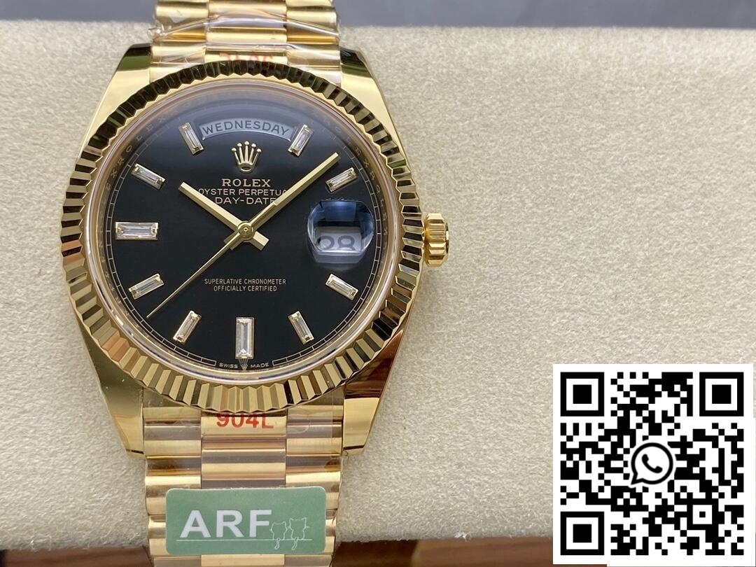 – Dial: The sophisticated dial is designed to replicate the original Day Date meticulously, featuring luminous markers and hands that ensure clarity, day or night. AR Factory’s attention to detail is evident in every aspect, from the dial’s smooth texture to the engraved logo, offering an authentic look and feel. The precision with which the date and day are displayed provides functionality and ease of use.