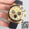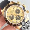 Dial: The exquisite Champagne dial of this replica watch embodies sophistication with its black sub-dials and bullet-shaped hour markers. These hour markers and the minute scale are filled with a luminescent material, allowing for readability even in the dark. The hands and the central chronograph second hand echo the same luminescent feature, facilitating easy time reading after dusk. AR Factory has meticulously replicated the exact texture and color of the original Rolex dial, ensuring that this clone captures the allure and elegance expected from a Daytona Cosmograph.