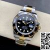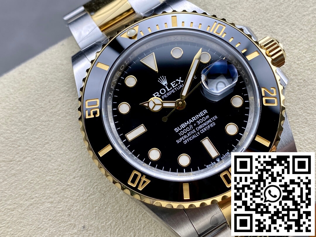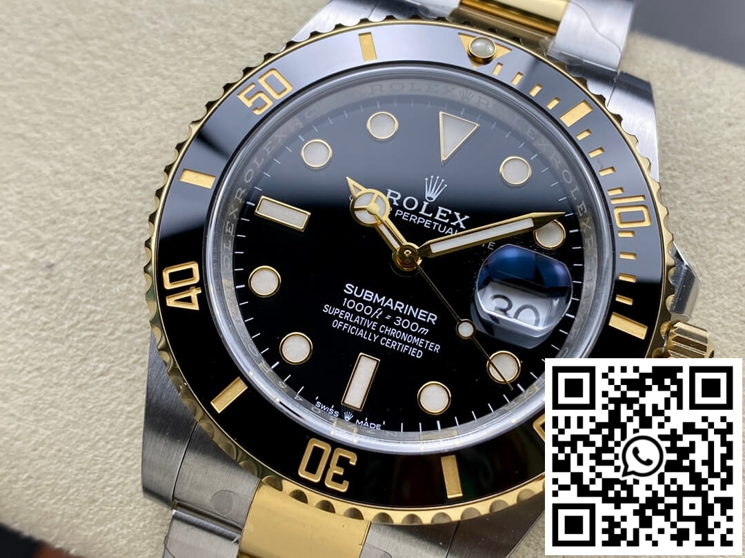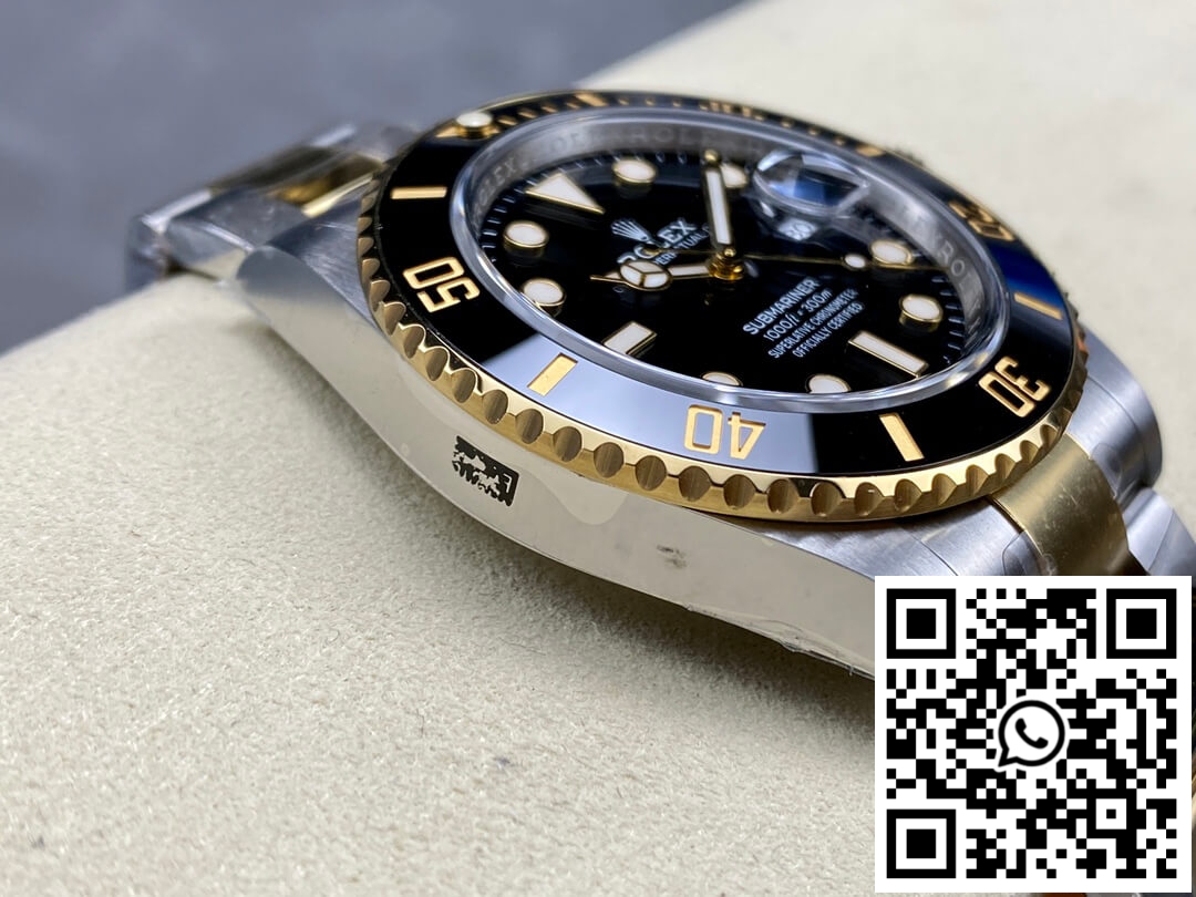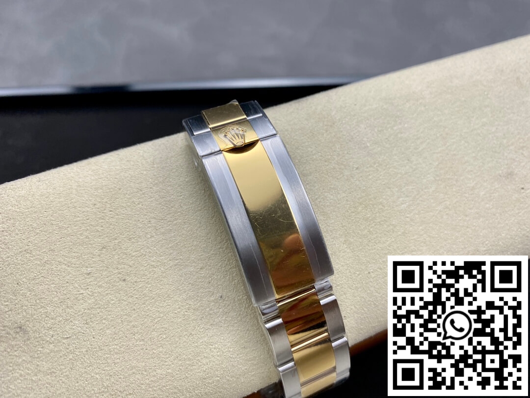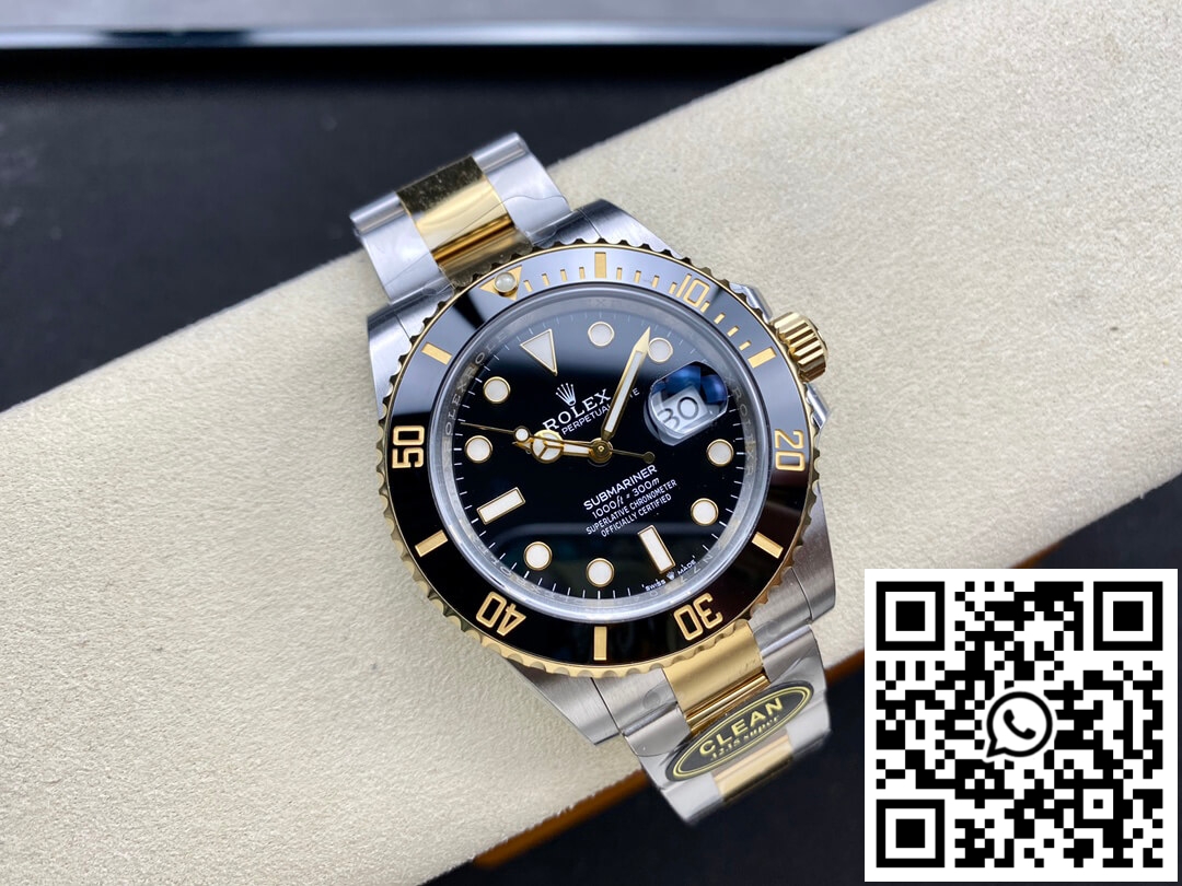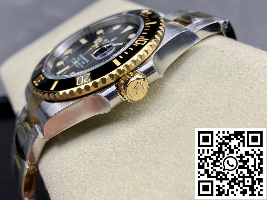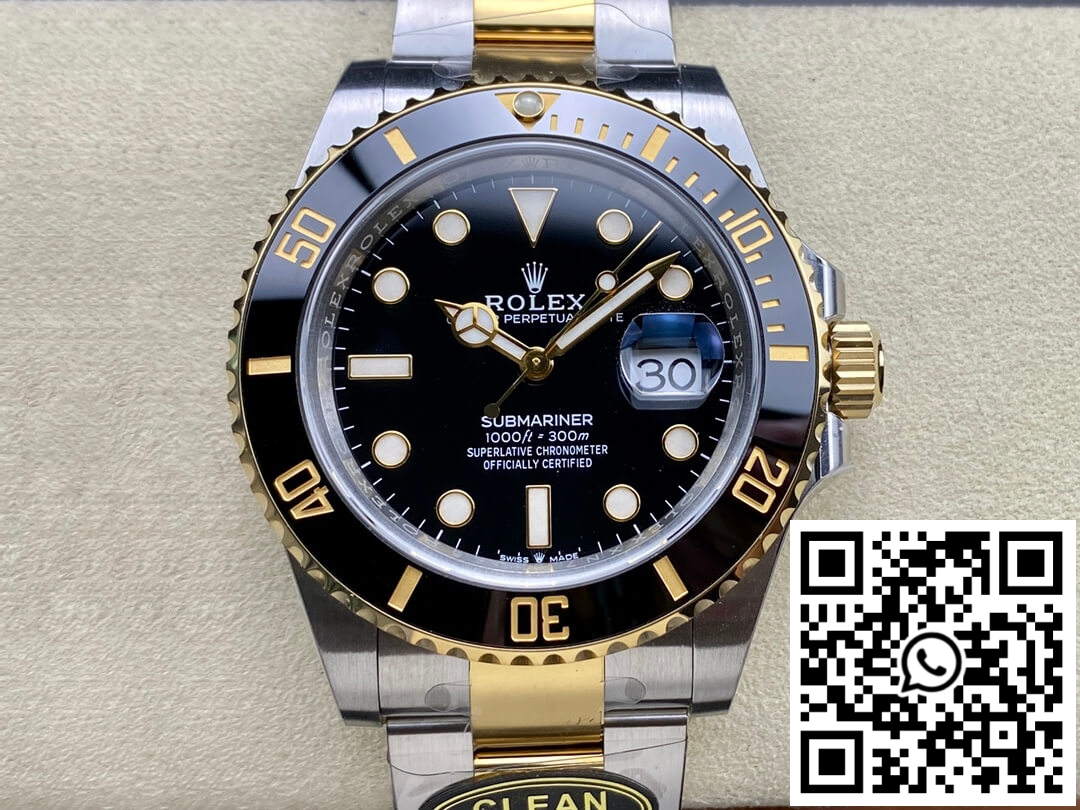 CASE: Crafted to perfection, this Clean Factory super clone of the Rolex Submariner features a robust 41mm case made with solid 904L stainless steel paired with stunning yellow gold. Maintaining a faithful reproduction of the genuine piece, this knockoff includes a screw-down case back and a Triplock triple waterproofness system, ensuring resilience against the elements. The meticulous placement of the ROLEX engravings on the Rehaut ring further enhances the replica’s authenticity and refined elegance.